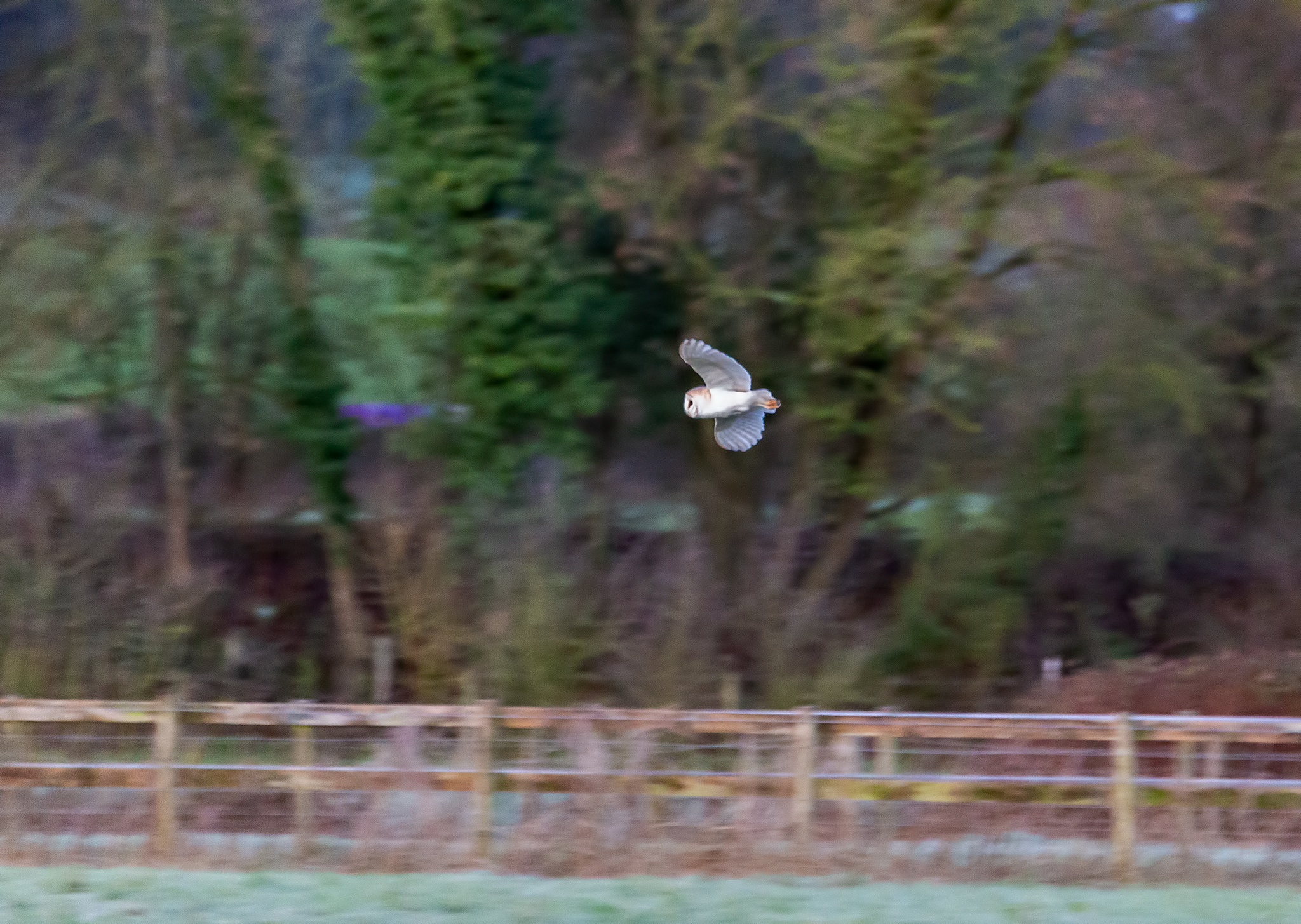 On Tuesday 22nd January the morning was chilly with a little light cloud and frost, there had been rain in the night which I should have realised it usually means the Barn Owl might be out later than usual trying to find a meal. So it gave me quite a surprise when I got over to Bere Marsh and spotted him quartering the field that Tilly and I were in. I only had me 300mm telephoto and it was still fairly dark but I attempted to get some photos. The Owl spent quite awhile in the field and was not bothered by Tilly. I can only assume he thought it was one of the Bere Marsh farm goats as Tilly has similar colouring!